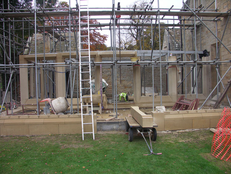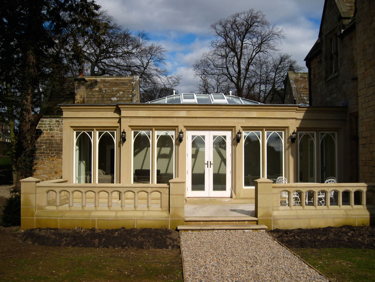 Below are photographs of a large, high specification Orangerie complete with Balustade wall and flag stone patio, which was recently completed much to our clients delight. This orangery has been featured in Natural Stone Specialist Magazine |